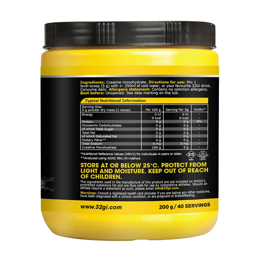 32Gi® Creatine Monohydrate provides scientifically validated support for both strength and endurance performance. This pure form of creatine enhances adenosine triphosphate (ATP) regeneration, increasing intramuscular energy availability for explosive power, reduced neuromuscular fatigue and accelerated recovery. The result is improved training capacity, lean muscle preservation and optimal performance all in a 100% pure, additive-free formula.
