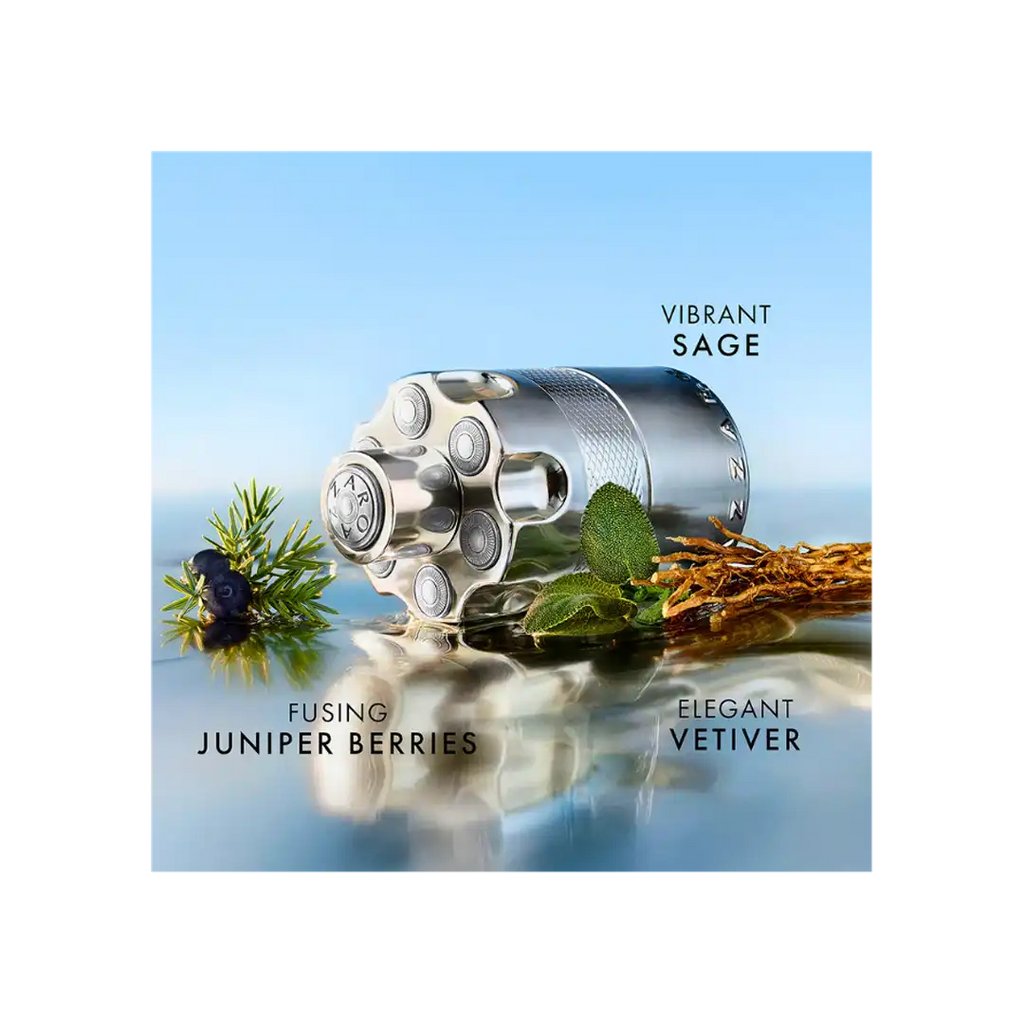 A contrasted combination of hot & fresh sensations spiked with the energizing notes of fusing Juniper Berries & vibrant Sage sensually enveloped in elegant Vetiver.