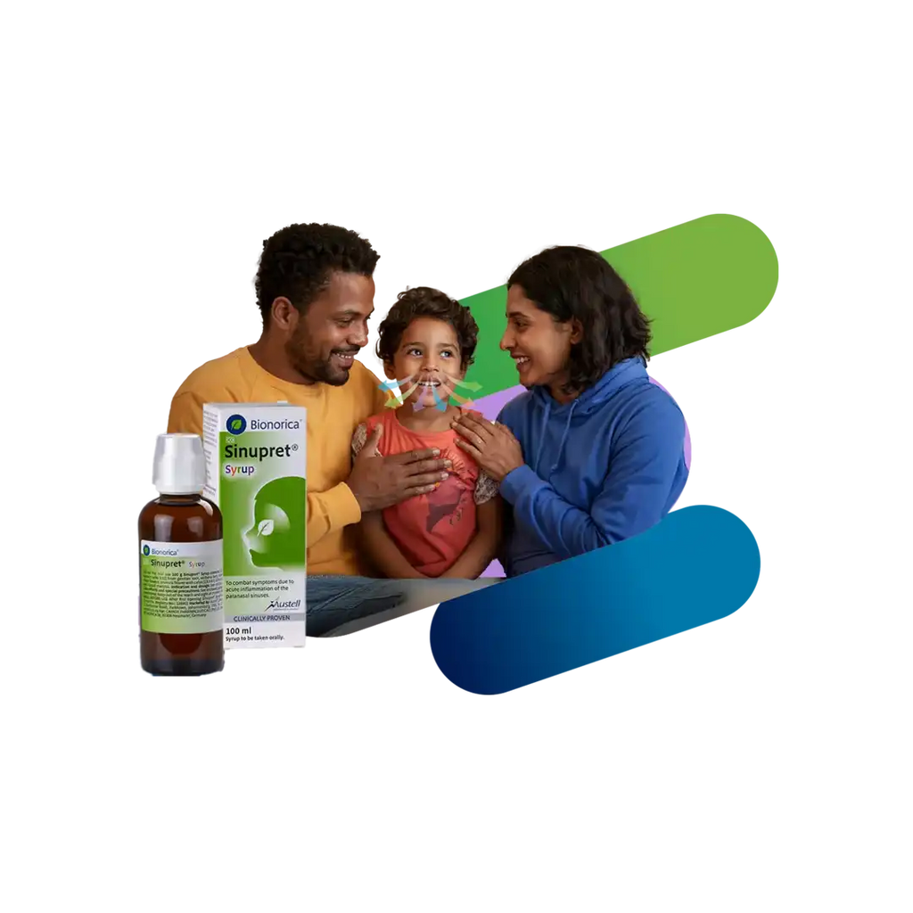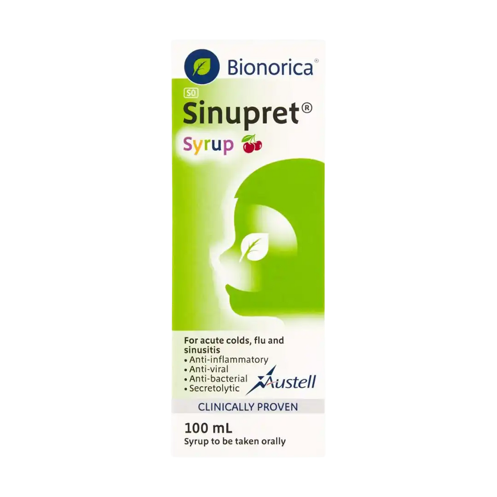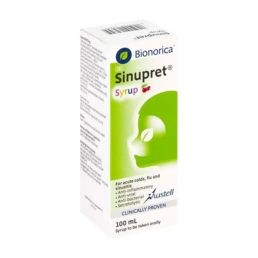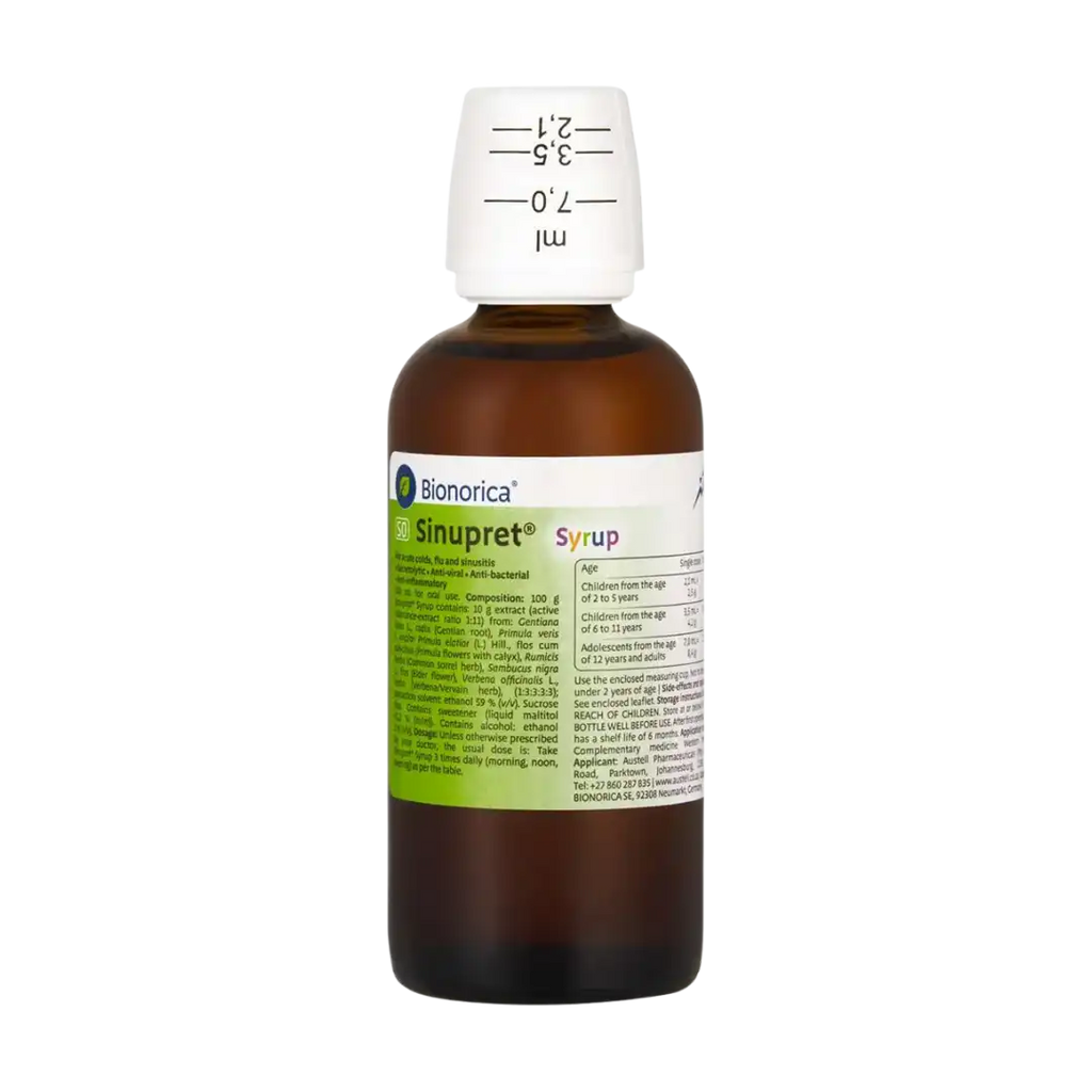 Bionorica seal of origin. Composition: 100 g Sinupret® syrup contains: 10 g extract (drug/extract ratio 1:11) from gentian root, verbena herb, common sorrel herb, elder flowers, primula flower with calyx (1:3:3:3:3); extracting agent: ethanol 59% (v/v). Contains liquid maltitol. Contains 8% (v/v) alcohol. Please refer to the package insert. 086028735. www.austell.co.za. For: Camox Pharmaceuticals (Pty) Ltd. Under license from: Bionorica SE 92308 Neumarkt, Germany.
