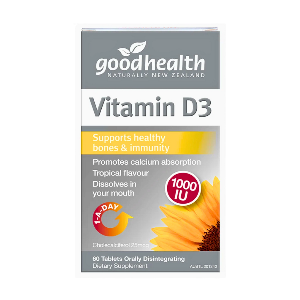 Good Health Vitamin D3 dissolving tabs provide 1000IU of Vitamin D3, the sunshine vitamin. Vitamin D helps to support strong healthy bones by supporting the uptake and absorption of calcium into the bone. It also helps with managing the winter blues by supporting mental and emotional wellbeing. Good Health Vitamin D3 is a delicious tropical flavoured tablet that instantly dissolves in your mouth so it’s ideal for people of all ages. It’s important for those that spend much of their time indoors at work, school, or home.