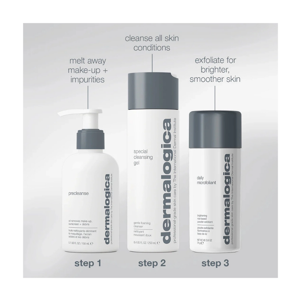 PreCleanse: Removes oils without clogging pores Conditioning essential fatty acids nourish skin Enables your prescribed Dermalogica Cleanser to work more efficiently Special Cleansing Gel: Washes away impurities without stripping or drying Calming agents help soothe and purify skin Thoroughly removes impurities, without disturbing the skin’s natural moisture balance Daily Microfoliant: Removes dulling surface debris and evens skin tone Reveals brighter, smoother skin Gentle enough for daily use.