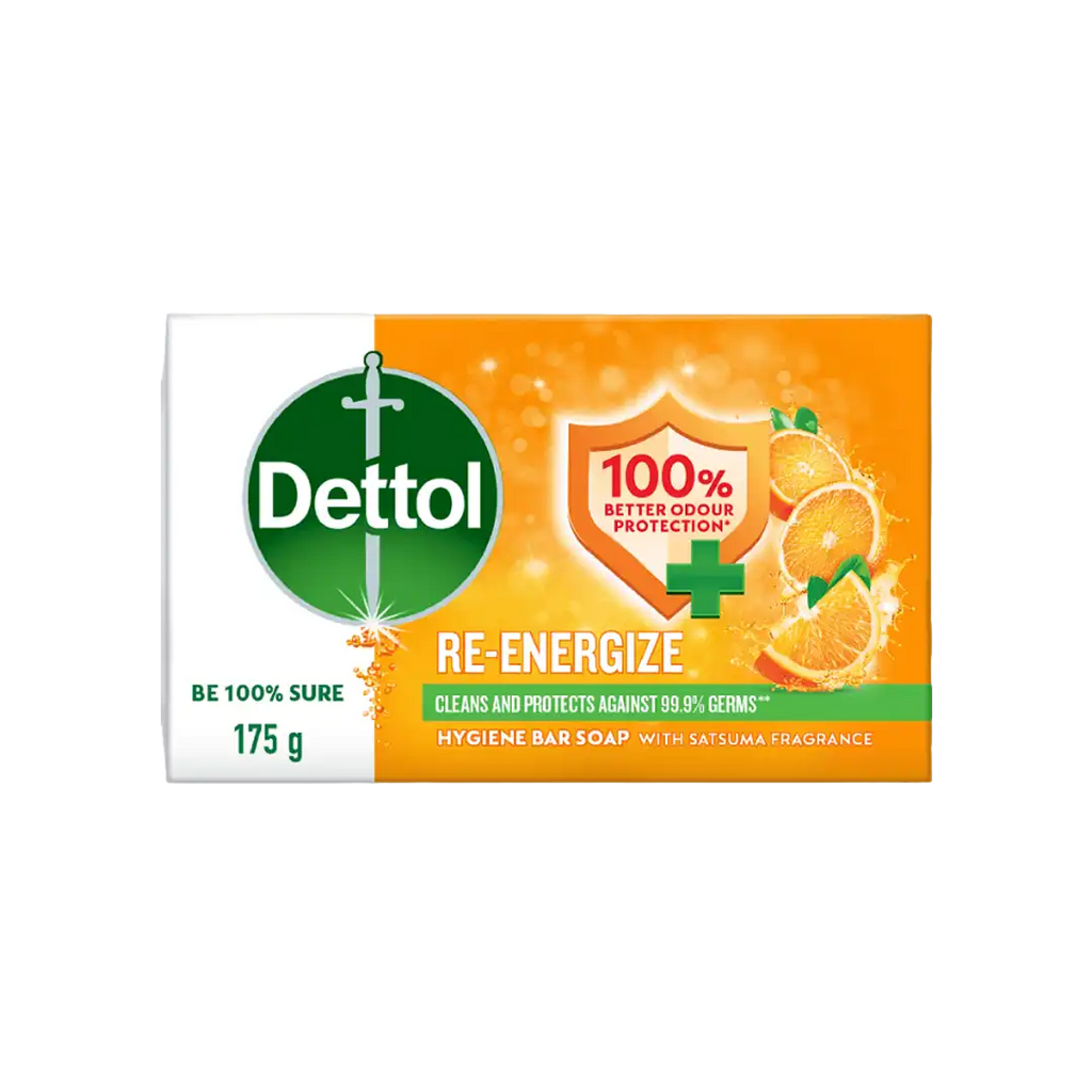 Dettol Soap Profresh Re-energise 175g is a hygiene bar designed to protect and keep you safe from illness-causing germs. Made to safeguard your body from a range of unseen germs, it is safe to use daily. Leaves skin feeling clean and invigorates the sense with its zesty scent.