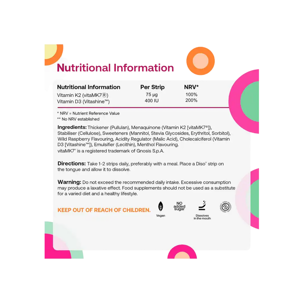 Furthermore, Diso D3 + K2 contains the precise balance of D3 and K2 your body needs to keep bones and teeth strong and healthy.