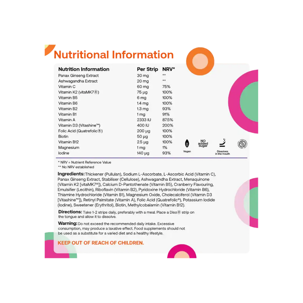 Each strip of Diso™ Multi-Vitamin dissolves quickly and is easy to take, making it the perfect addition to your busy lifestyle. No water required, just a fast and effective way to nourish your body.