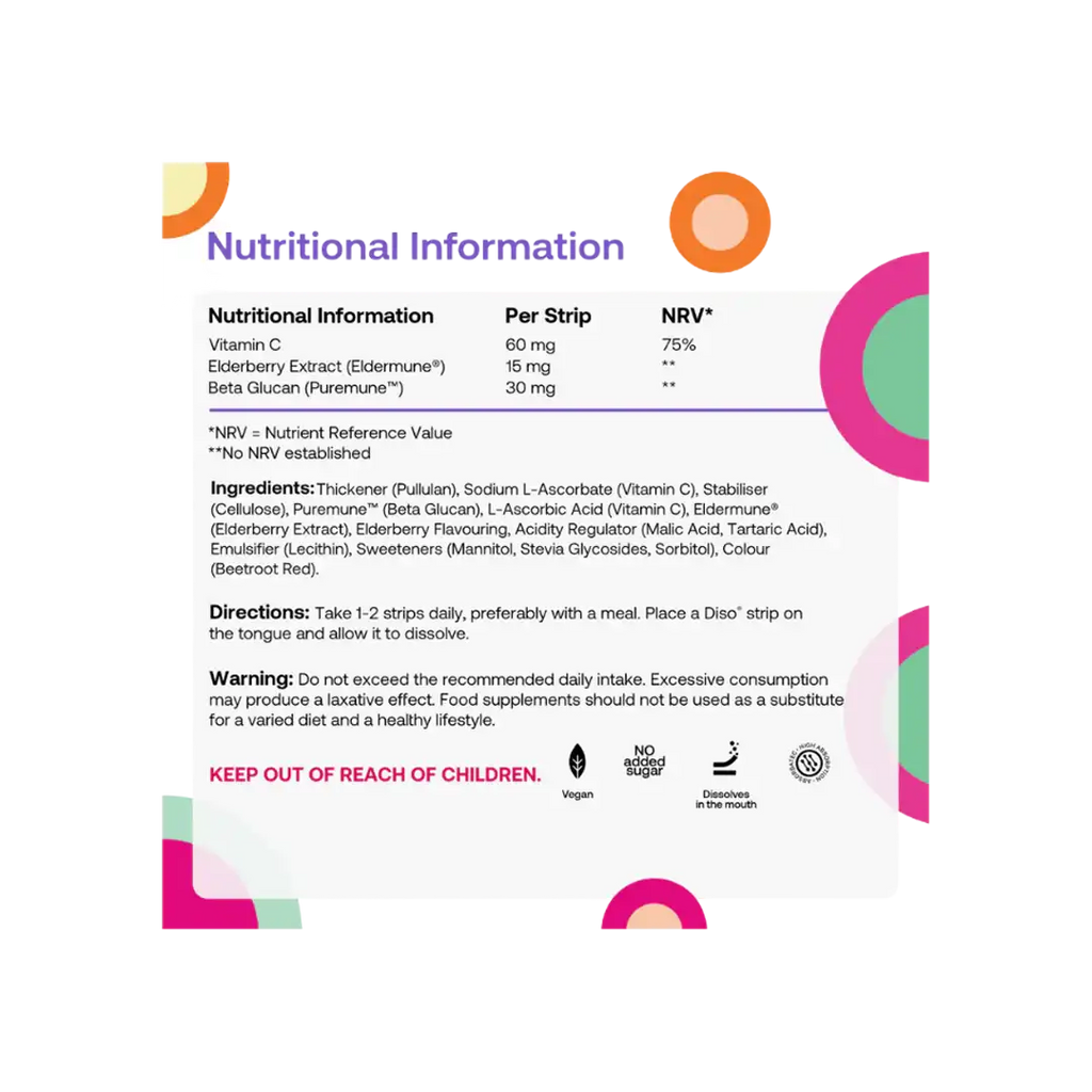 Diso Vitamin C Strips provide your body with the essential Vitamin C it needs to help maintain normal immune function and overall wellness. Furthermore, we added Beta Glucans, known for their role in supporting immune health.