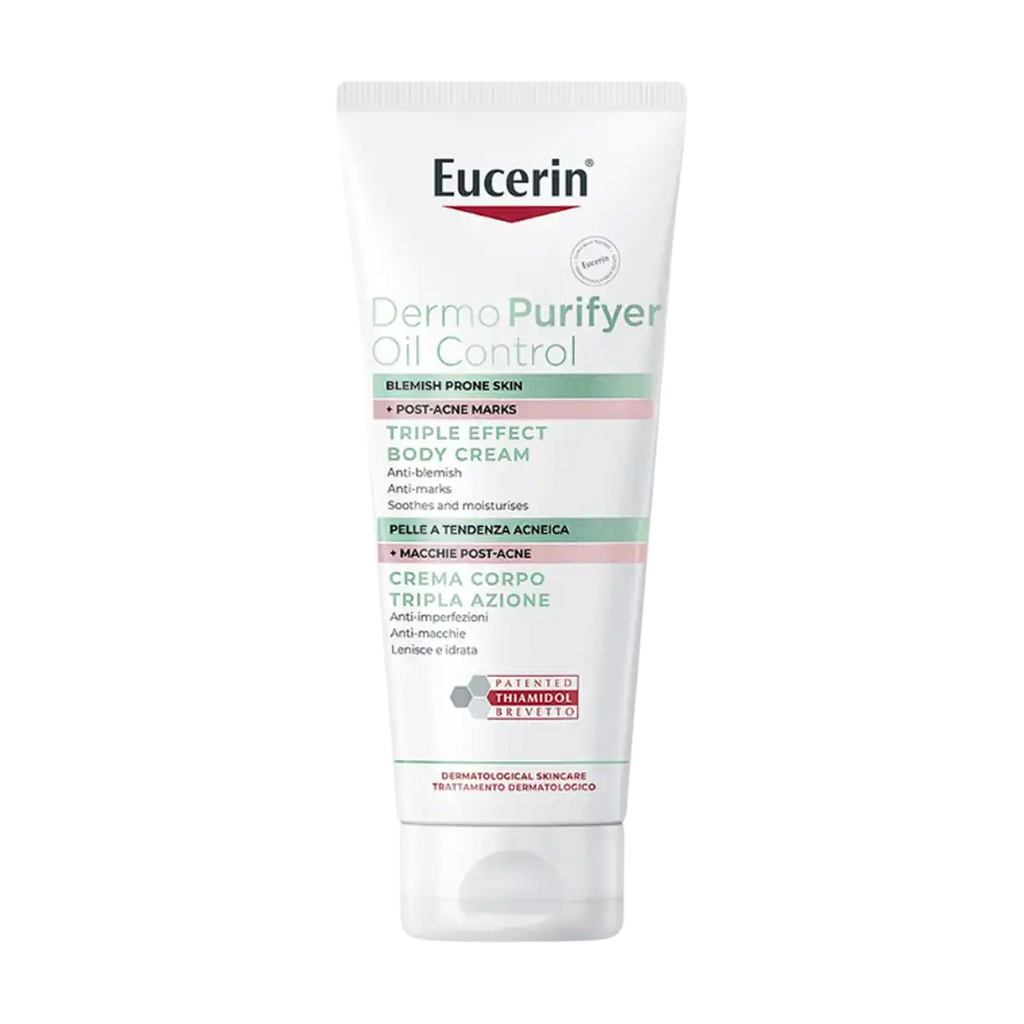 Acne leaves its marks, physically and emotionally. It affects up to 95% of adolescents and 40% of adultsx. Around 50% experience body or truncal acnexx. Most targeted body areas are back, chest and shouldersxxx. Up to 87% of those affected by acne also experience post-acne marksxxxx, which can persist for several years or even a decadexxxxx with the sun aggravating the symptoms. Eucerin DermoPure Triple Effect Body Cream combines powerful active ingredients to finally reduce blemishes and post-acne marks while soothing and moisturising the skin: 1. Anti-blemish: Salicylic Acid effectively reduces persistent blemishes 2. Anti-marks: Patented Thiamidol visibly reduces persistent post-acne marks and prevents their appearance. 3. Soothes and moisturises: Anti-inflammatory Licochalcone A soothes irritations and helps to reduce redness. Glycerin moisturises intensively. For an instantly soothed and moisturised skin, and visibly clearer and more even skin after two weeks. 97% confirm: it reduces body blemishes and post-acne marks.