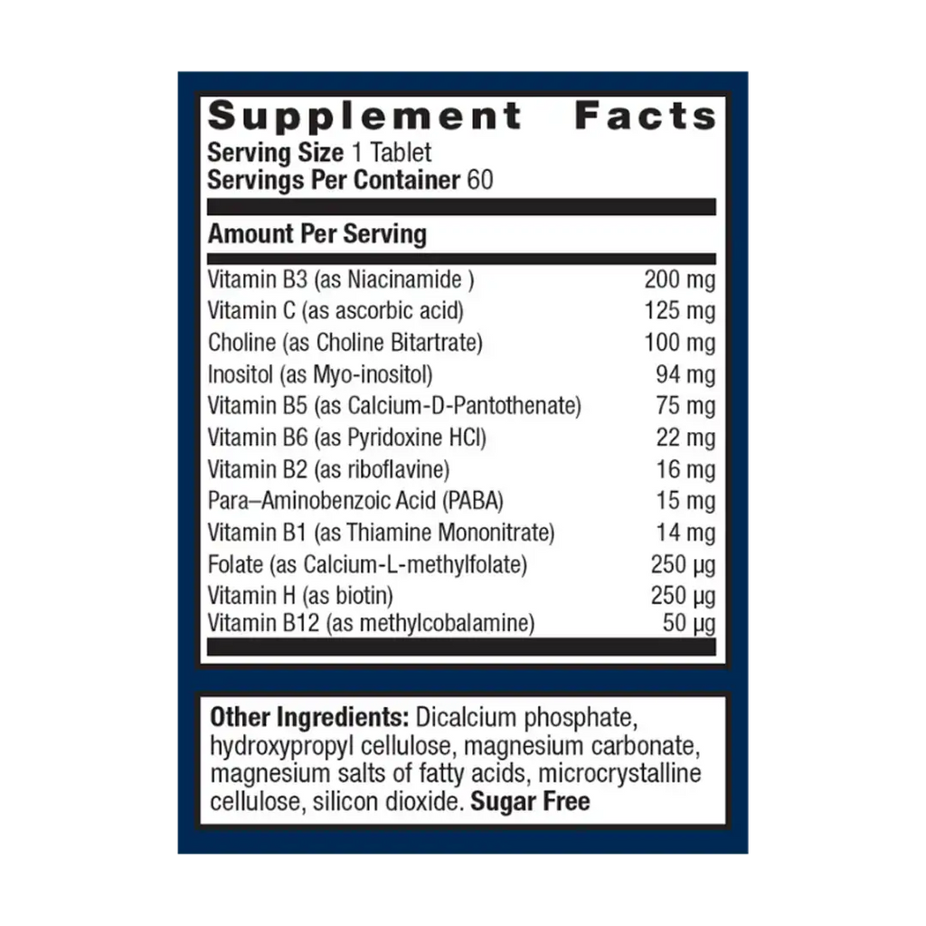 Ingredients: Vitamin C (as ascorbic acid) - Thiamin (as thiamin mononitrate) - Riboflavin - Niacin (as niacinamide and niacin) - Vitamin B6 (as pyridoxine HCl) - Folate (as calcium L-5-methyltetrahydrofolate) - Vitamin B12 (as methylcobalamin) - Biotin - Pantothenic Acid (as D-calcium pantothenate) - Choline (as choline bitartrate) - Inositol - para-Aminobenzoic Acid (PABA) - Other Ingredients: Microcrystalline cellulose, stearic acid (vegetable), silica, magnesium stearate (vegetable), and coating (hypromellose, medium chain triglycerides, and hydroxypropylcellulose).