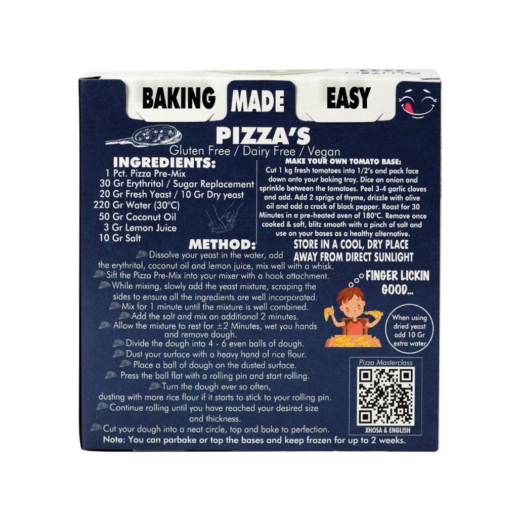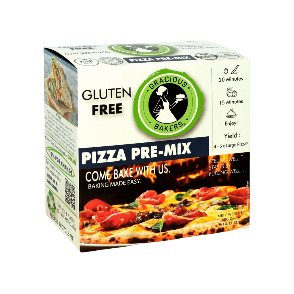 Savour the taste of homemade pizza with Gracious Bakers Gluten-Free Pizza Pre-Mix! Perfectly crafted for those with gluten sensitivities, this easy-to-use pizza mix allows you to create delicious, fresh pizza crusts without the hassle of traditional dough-making. We’ve spent years perfecting our Gluten Free Pizza base Pre-mix, and the results are impressive. Once baked, It looks and slices like traditional Pizza, and is easy to prepare. Create Italian style pizza bases with our perfectly crafted pizza base pre-mix, so that you too can create amazing pizza masterpieces from home – and allergen free of course! Follow the simple steps on our recipe or bake along with our masterclass, and you’ll soon be savouring on slices, suited for the whole family. We recommend dusting your work area with rice flour to avoid dough sticking to surfaces and utensils during preparation.