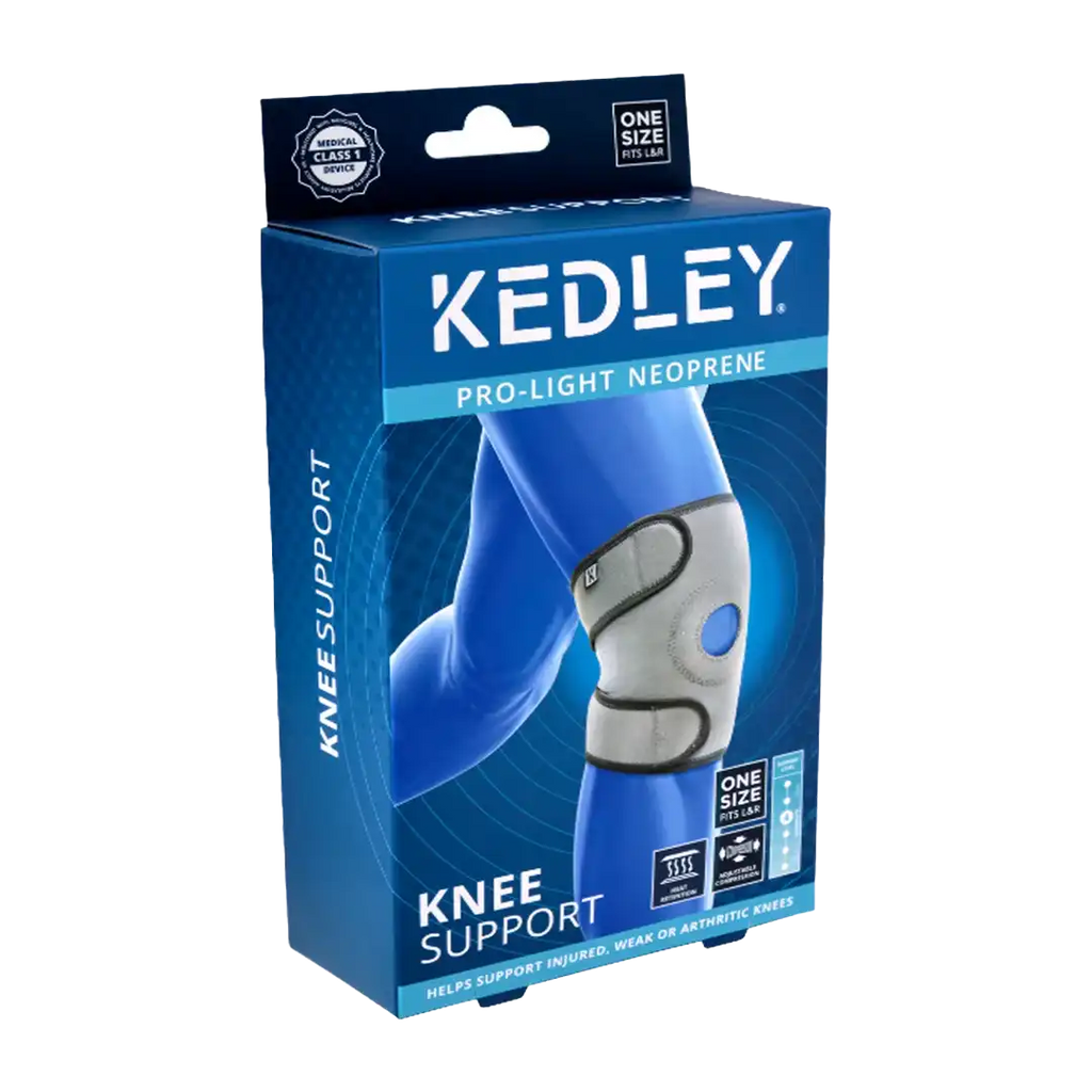 The Kedley Knee Support has an open patella design with reinforced lining for additional support. The three-way strapping system allows for a secure fit.