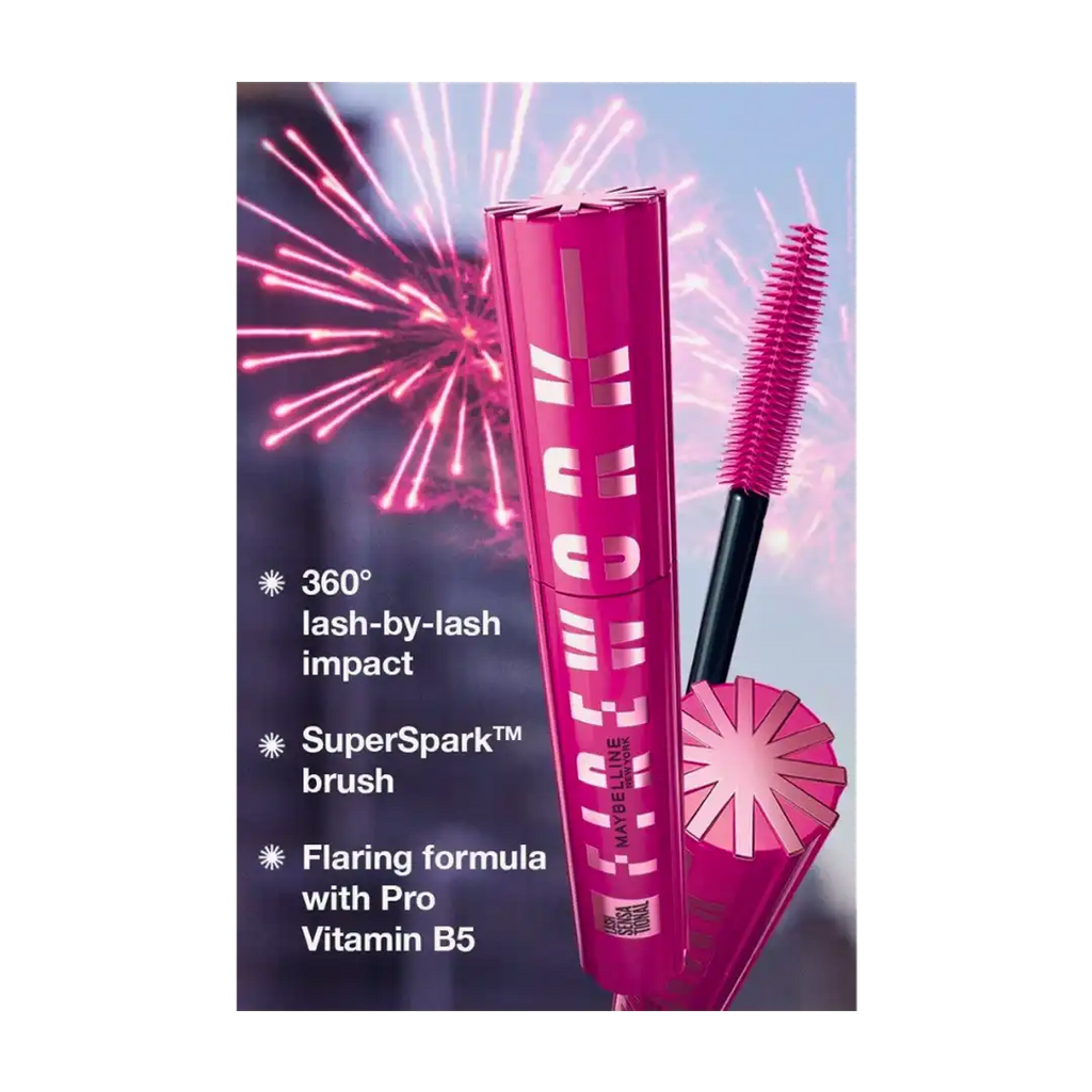 maybeLash Sensational Firework mascara delivers 360° extraordinary lash impact and full flare. A Sensational Firework of lashes. Flex Spark brush with bristles arranged in a spiral firework pattern to shoot lashes up and out. Gel based flaring formula infused with Pro-Vitamin B5. Buildable, clump-resistant impact. Lashes feel conditioned. Resists smudging. Up to 24hr wear. Ready for main character lashes? Spark 360° lash-by lash extrablack impact in new Electro Black shade. A Sensational Firework of lashes. With a conditioning formula infused with Pro-Vitamin B5,the newest member of the fan-favorite Lash Sensational mascara family charges lashes from root to tip. Its custom Flex Spark brush is made with different lengths of flex bristles, arranged in a spiral firework pattern to hug and shoot lashes up and out. Allergy tested.Ophthalmologist tested. Suitable for contact lens wearers.