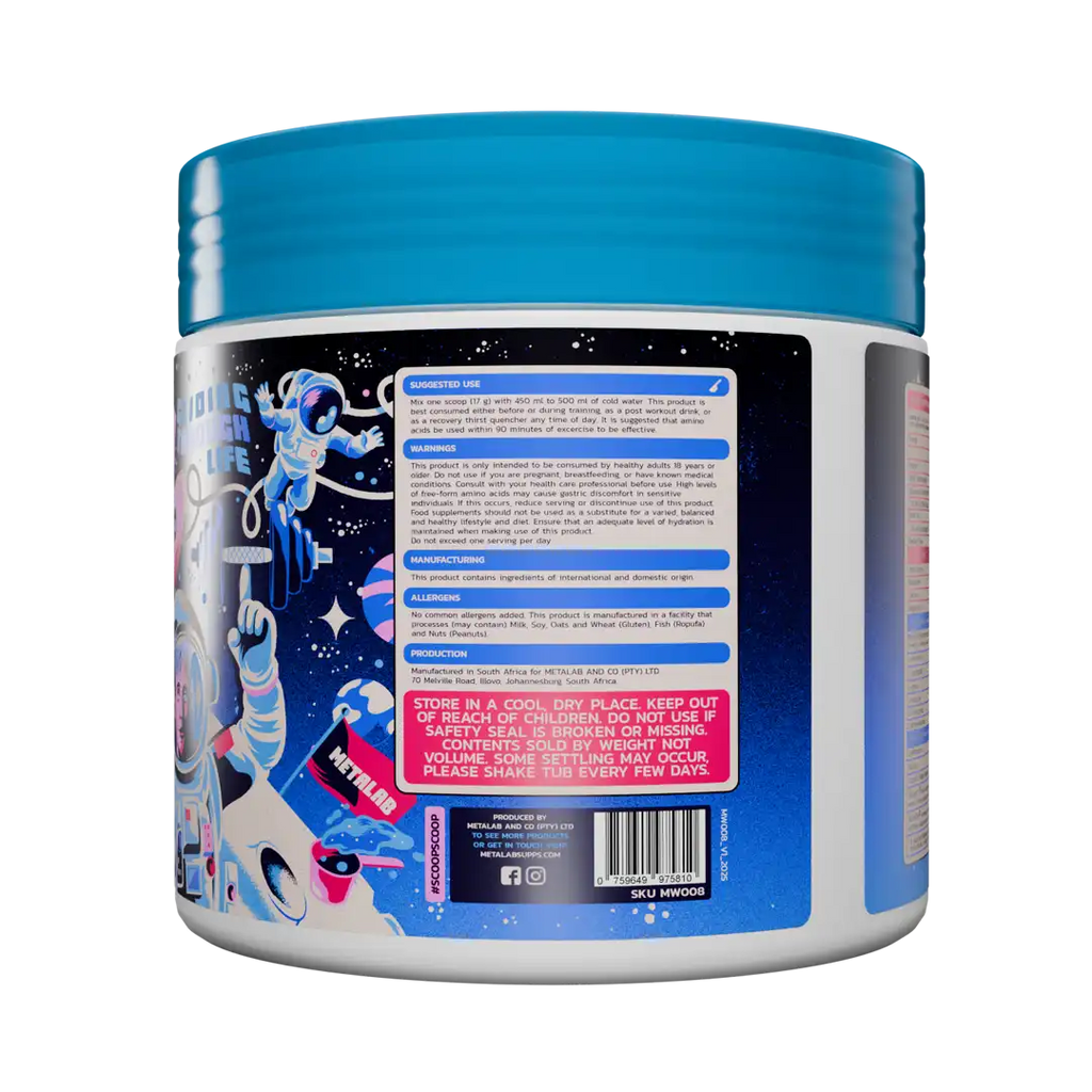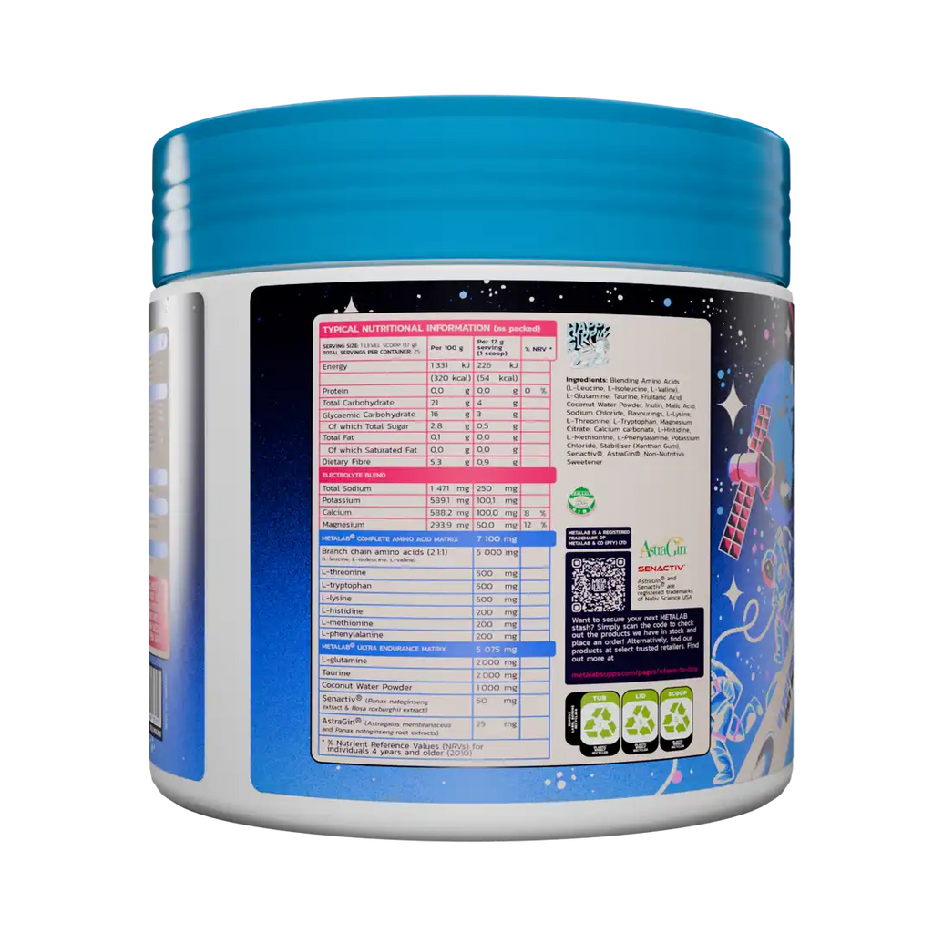 Ingredients: Blending Amino Acids (L-Leucine, L-Isoleucine, L-Valine), L-Glutamine, Taurine, Fruitaric Acid, Coconut Water Powder, Inulin, Malic Acid, Sodium Chloride, Flavourings, L-Lysine, L-Threonine, L-Tryptophan, Magnesium Citrate, Calcium Carbonate, L-Histidine, L-Methionine, L-Phenylalanine, Potassium Chloride, Stabiliser (Xanthan Gum), Senactiv®, AstraGin®, Non-Nutritive Sweetener (Sucralose).