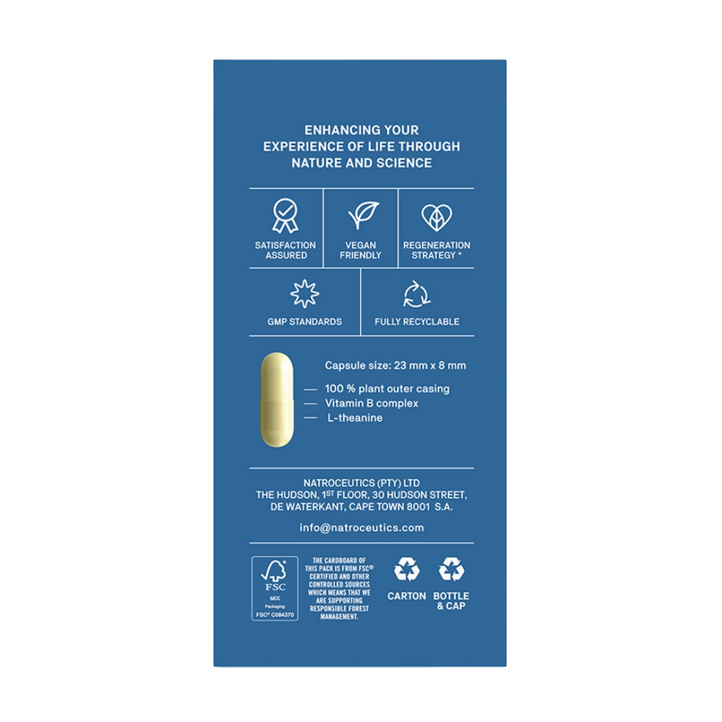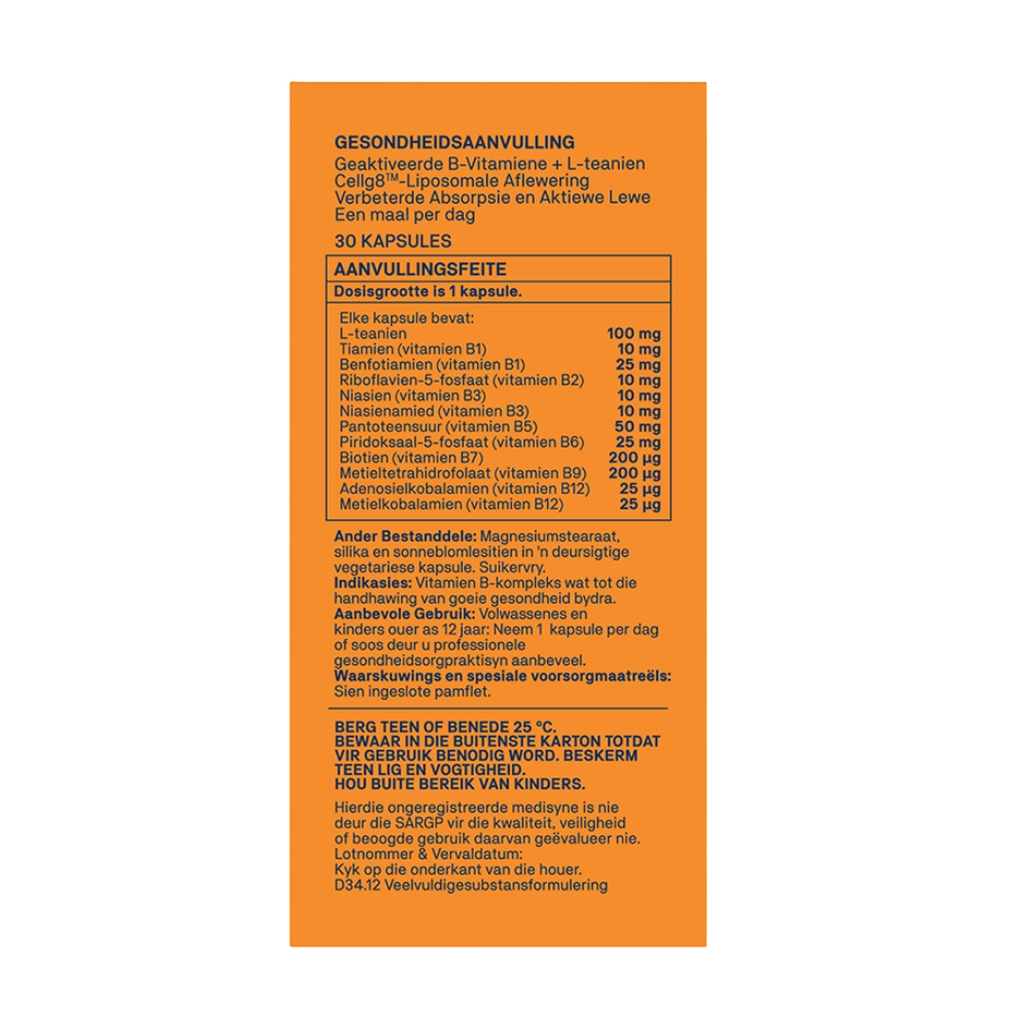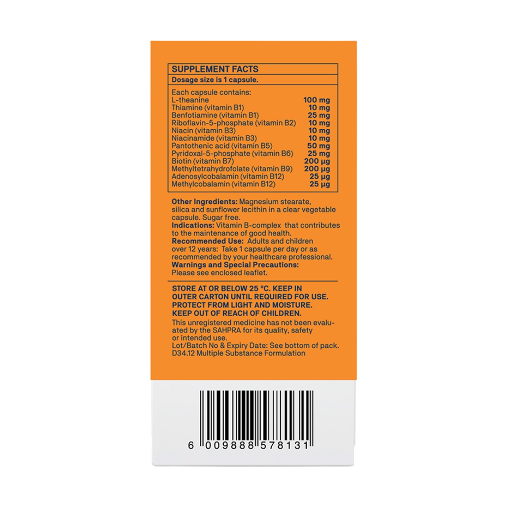 L-theanine 100 mg, Thiamine (vitamin B1) 10 mg, Benfotiamine (vitamin B1) 25 mg, Riboflavin-5-phosphate (vitamin B2) 10 mg, Niacin (vitamin B3) 10 mg, Niacinamide (vitamin B3) 10 mg, Pantothenic Acid (vitamin B5) 50 mg, Pyridoxal-5-phosphate (vitamin B6) 25 mg, Biotin (vitamin B7) 200 μg, Methyltetrahydrofolate (vitamin B9) 200 μg, Adenosylcobalamin (vitamin B12) 25 μg, Methylcobalamin (vitamin B12) 25 μg, Magnesium stearate, Silica, Sunflower Lecithin in a clear vegetable capsule.