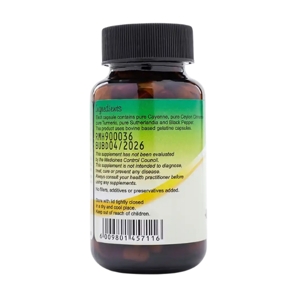 Ingredients: Each capsule contains 500mg of Four in One, which is a combination of Cayenne, Organic Ceylon Cinnamon, Organic Turmeric and Sutherlandia Powder.