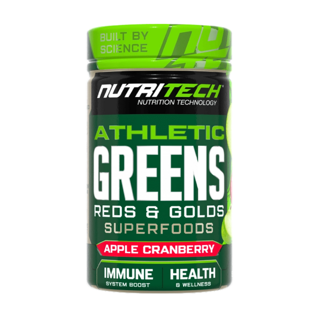 NUTRITECH Athletic Greens, your daily, drinkable scoop of greens, reds and golds. Vitamins, minerals, & probiotics from whole food sourced ingredients. Naturally sweetened, Colourant Free, Gluten Free.