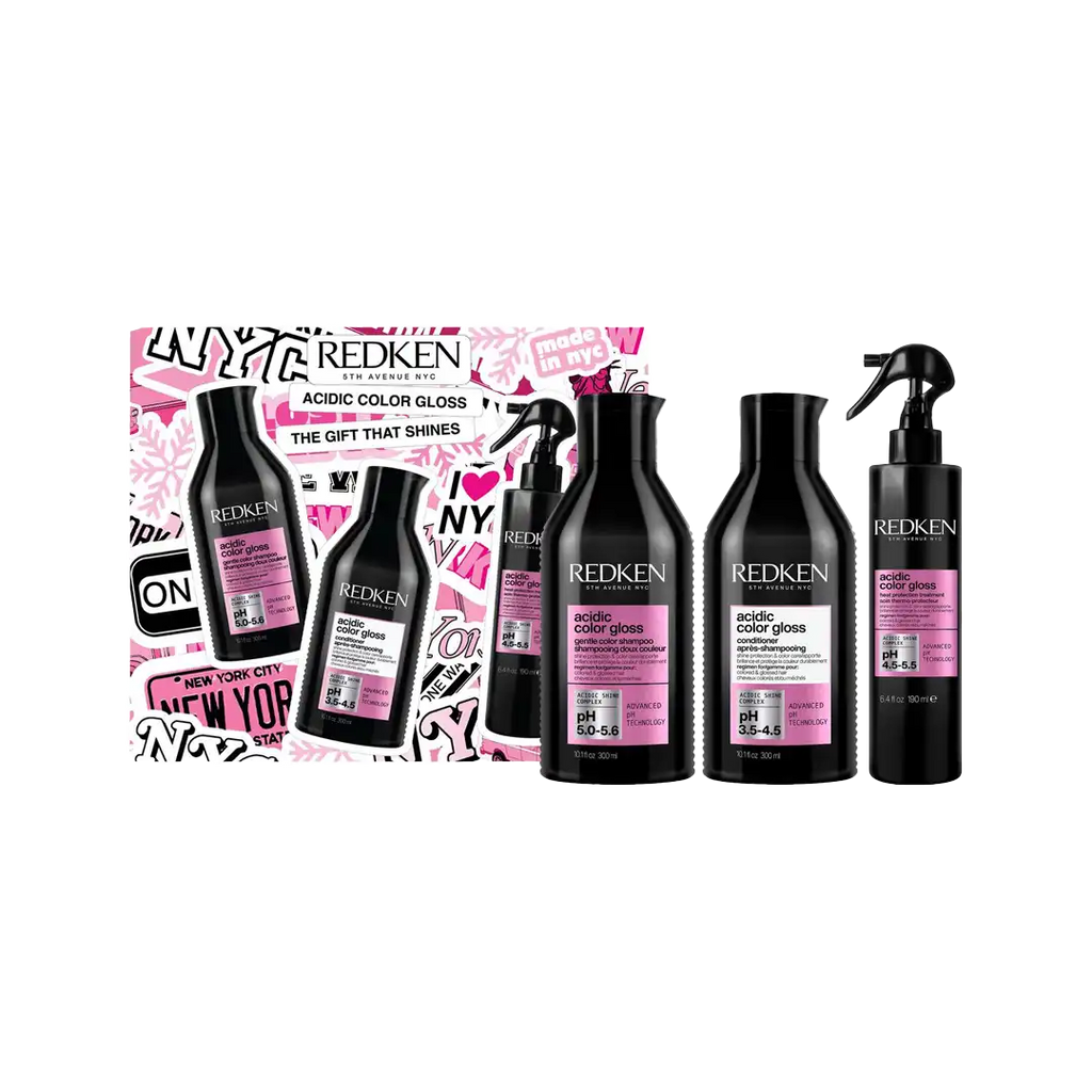 Celebrate with Redken and add shine to your hair with a giftable, limited edition set that includes an Acidic Color Gloss Conditioner, an Acidic Color Gloss Leave-In Treatment and a complimentary Acidic Color Gloss Shampoo. The Acidic Color Gloss hair care range extends and maintains professional permanent color, glosses and toners. With acidic pH formulas to help seal the cuticle and deliver intense, molecular-level shine, this salon professional hair care system is best for color-treated hair lacking shine and vibrancy.