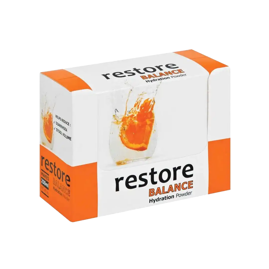 Restore balance hydration powder 6gm is a hydration powder that assists the body to reduce diarrhoea duration by up to 22% This powder reduces stool volume up to 36% and replaces electrolytes after exercising. Restore balance hydration powder helps to restore fluid balance after over indulgence and boost energy. It comes in a pack size of 6 grams.