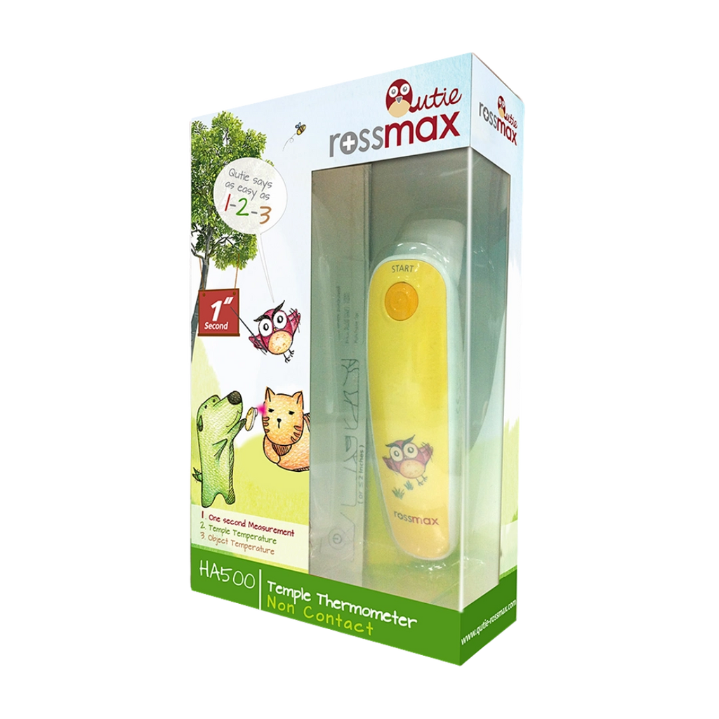 For non-contact temperature measurement - The advanced infrared temperature measuring technology provides safe, accurate, reliable and hygienic readings for measuring both temple and object temperature. The temple temperature reading lookup table was calculated and developed based on systematic skin clinical data statistics to accommodate fever and non-fever subjects, under different operating environment. The one second measurement thermometer without contacting skin is a suitable choice for obtaining body temperature and prevents cross contamination by measuring around 5 cm from the temple.