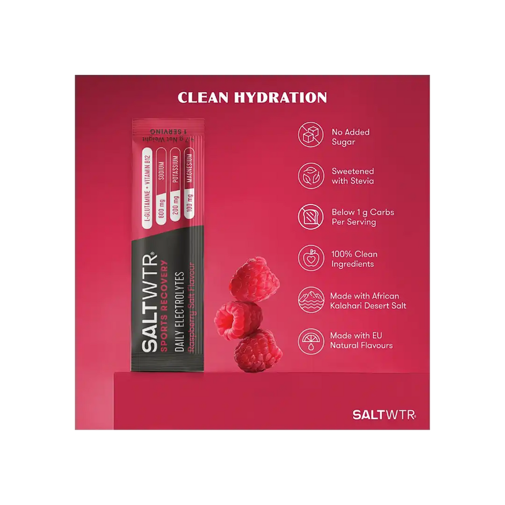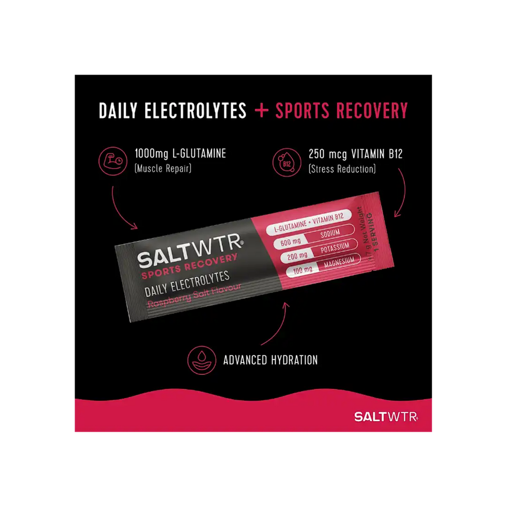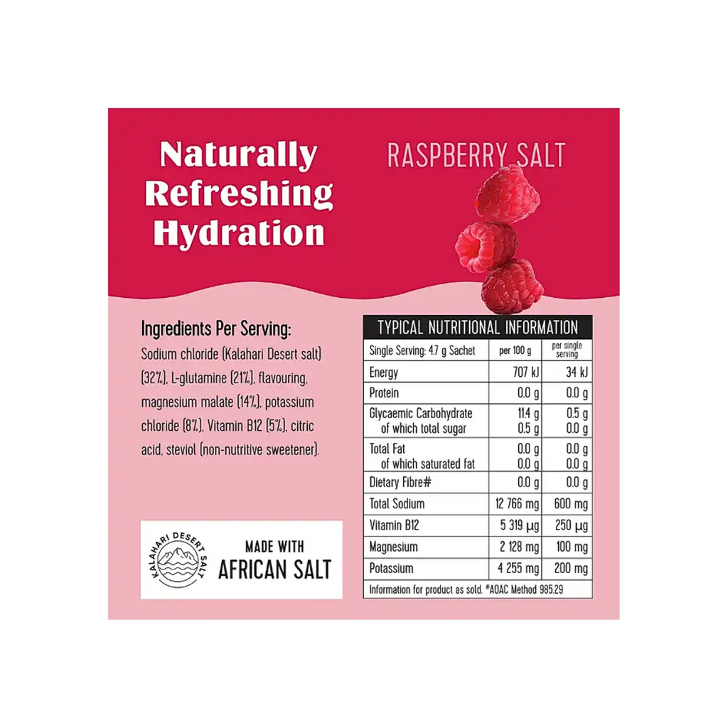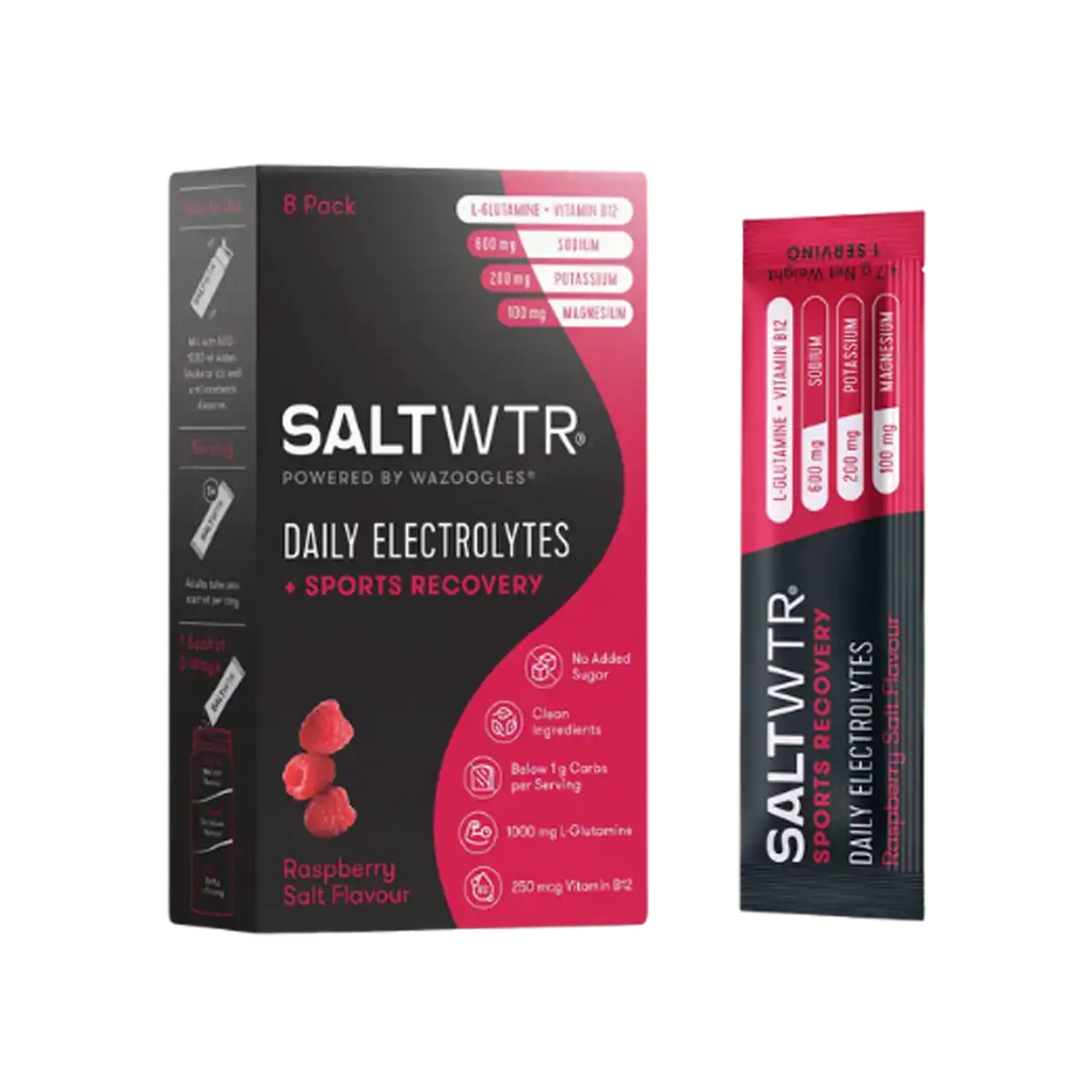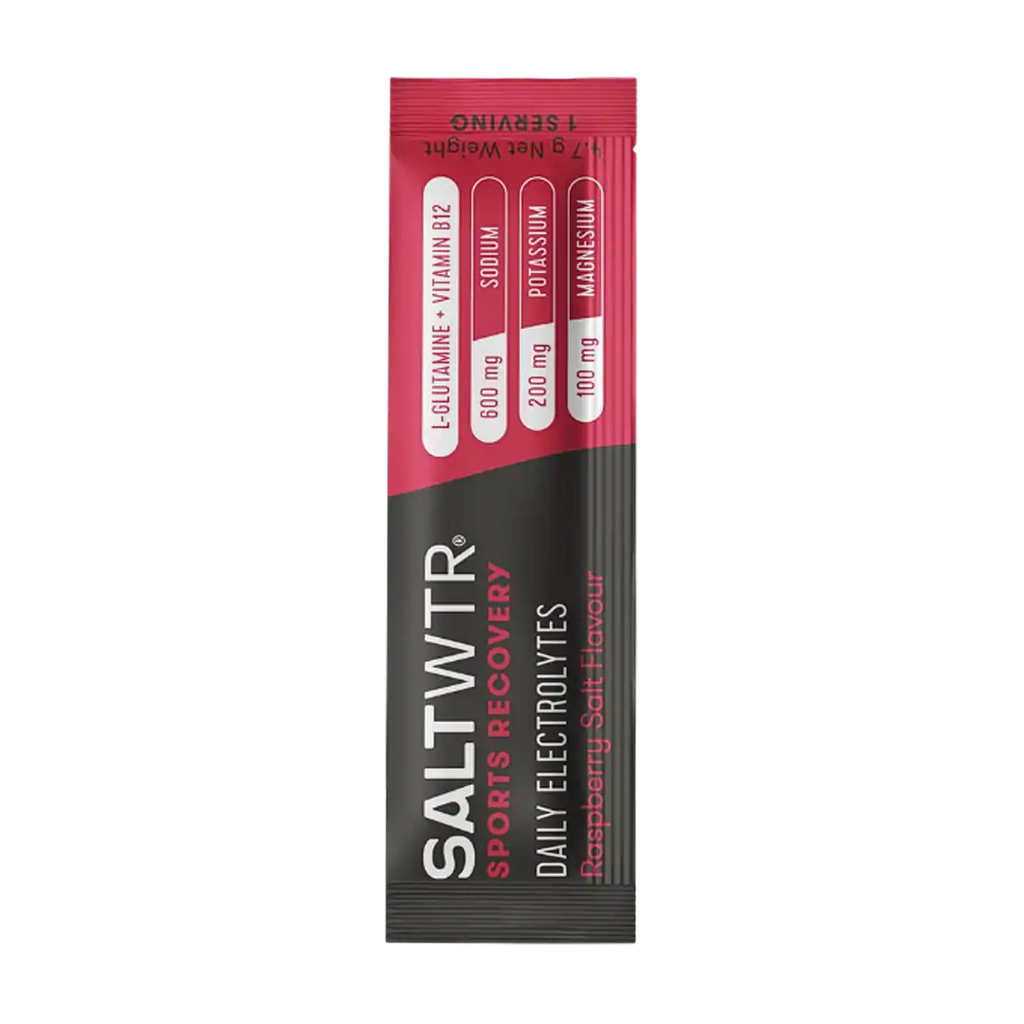 Raspberry Salt Sports Recovery is a delicious, natural electrolyte blend of Sodium, Magnesium, Potassium and trace minerals, additionally elevated by L-Glutamine and Vitamin B12. All powerful, natural ingredients proven to support muscle recovery.
