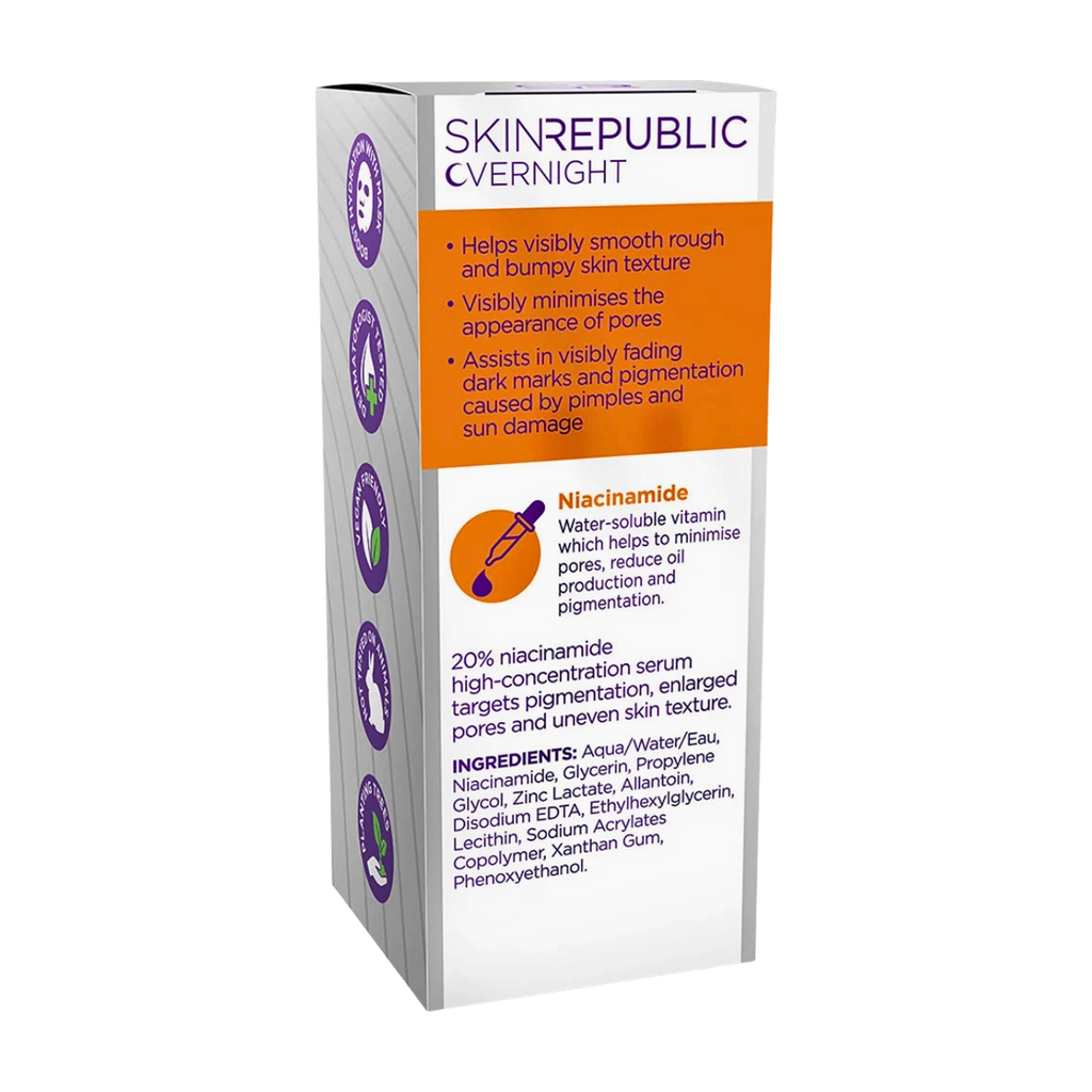 Dosage and Directions: Cleanse face. Apply a few drops of serum to face and neck. Wait for a minute for serum to absorb. Follow with a Skin Republic Face Mask or moisturiser. Our Niacinamide 20% Overnight Serum is the perfect addition to your evening routine.