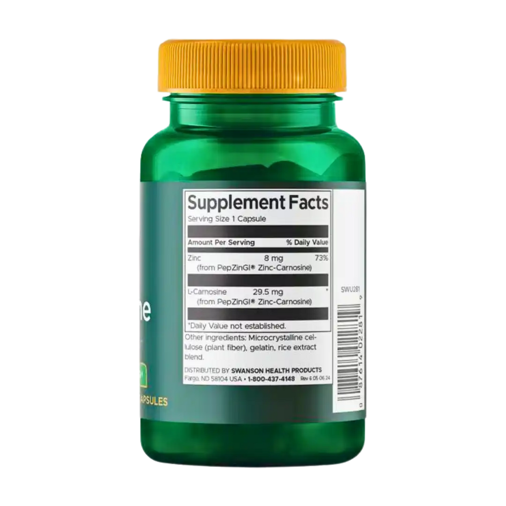 Swanson Zinc Carnosine delivers patented PepZinGI®, a combination of the mineral zinc and the amino peptide L-carnosine that provides protection to all areas of the stomach. The lining of the stomach is protected from its own caustic gastric juices by a thin layer of gel-like mucus. Evidence suggests that the combination of ingredients in PepZinGI isn't easily broken down by these harsh gastric juices, so it is able to strengthen the mucosal barrier by adhering to the stomach wall.