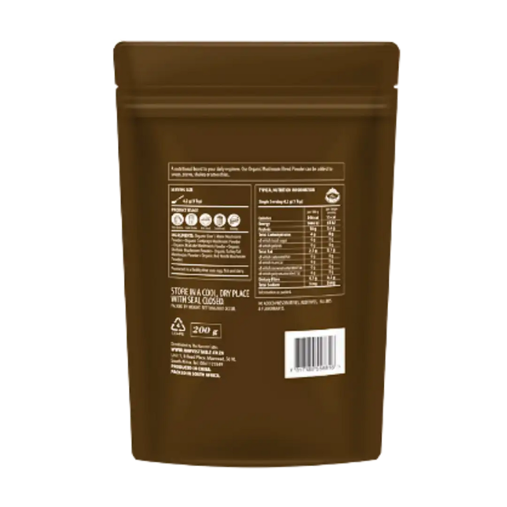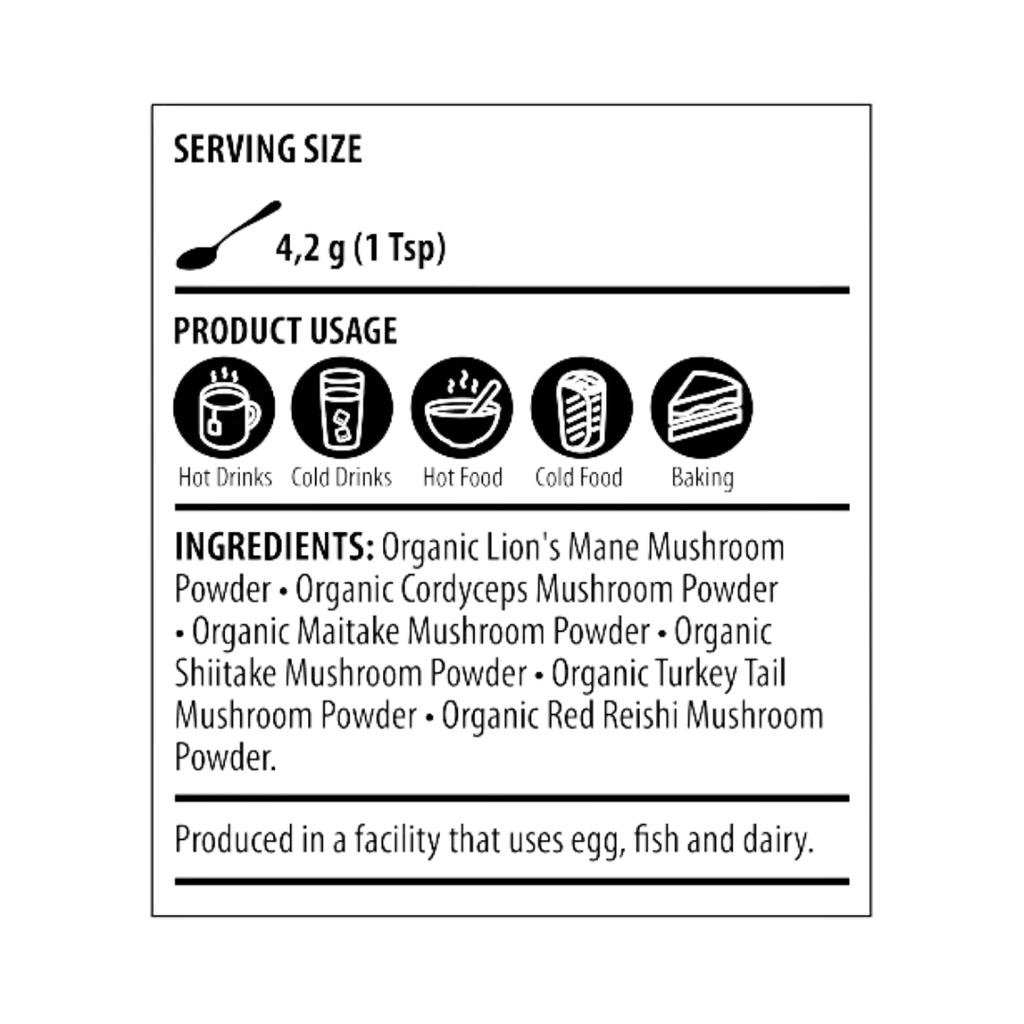 Ingredients: Organic Lion's Mane Mushroom Powder, Organic Cordyceps Mushroom Powder, Organic Maitake Mushroom Powder, Organic Shiitake Mushroom Powder, Organic Turkey Tail Mushroom Powder and Organic Red Reishi Mushroom Powder.