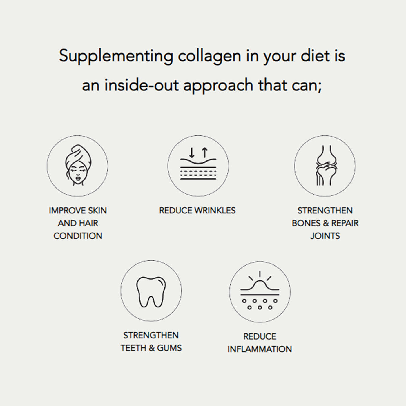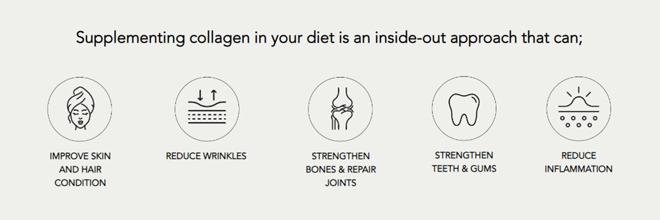 Adding collagen to your daily diet is considered an inside-out approach that may influence various aspects of health, including the condition of skin and hair, bone strength, and potential inflammation reduction.