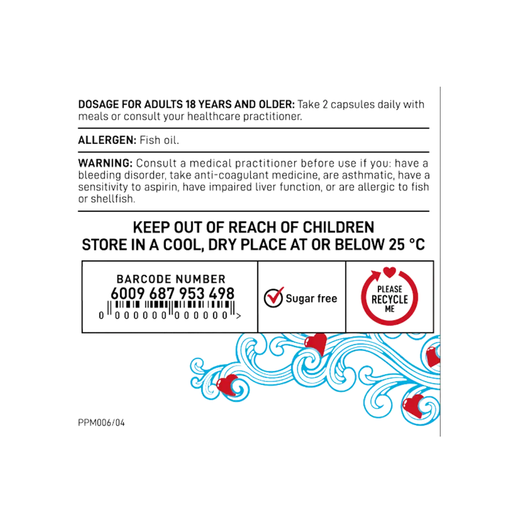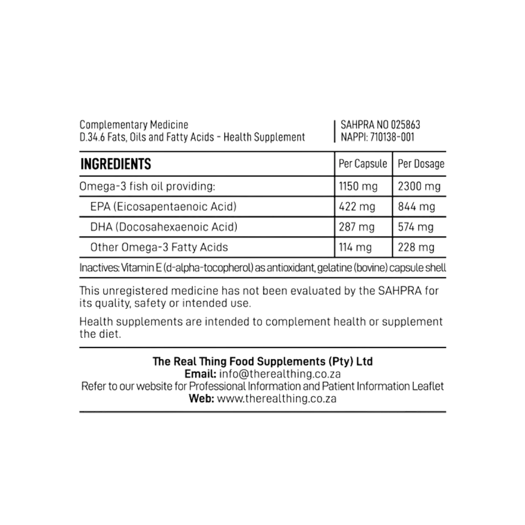 Direction and Dosage: Take 2 capsules (1564mg omega 3) daily with a meal. This can be increased according to advise from your healthcare practitioner.