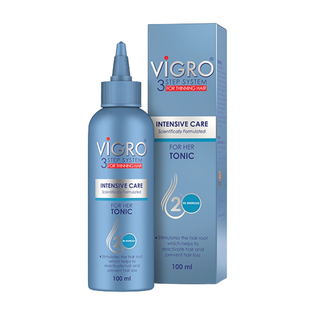 Vigro Intensive Care For Her Tonic 100ml stimulates the hair root, which helps to reactivate hair and prevent hair loss. Scientifically formulated, it complements Vigro's 3-step system for thinning hair.