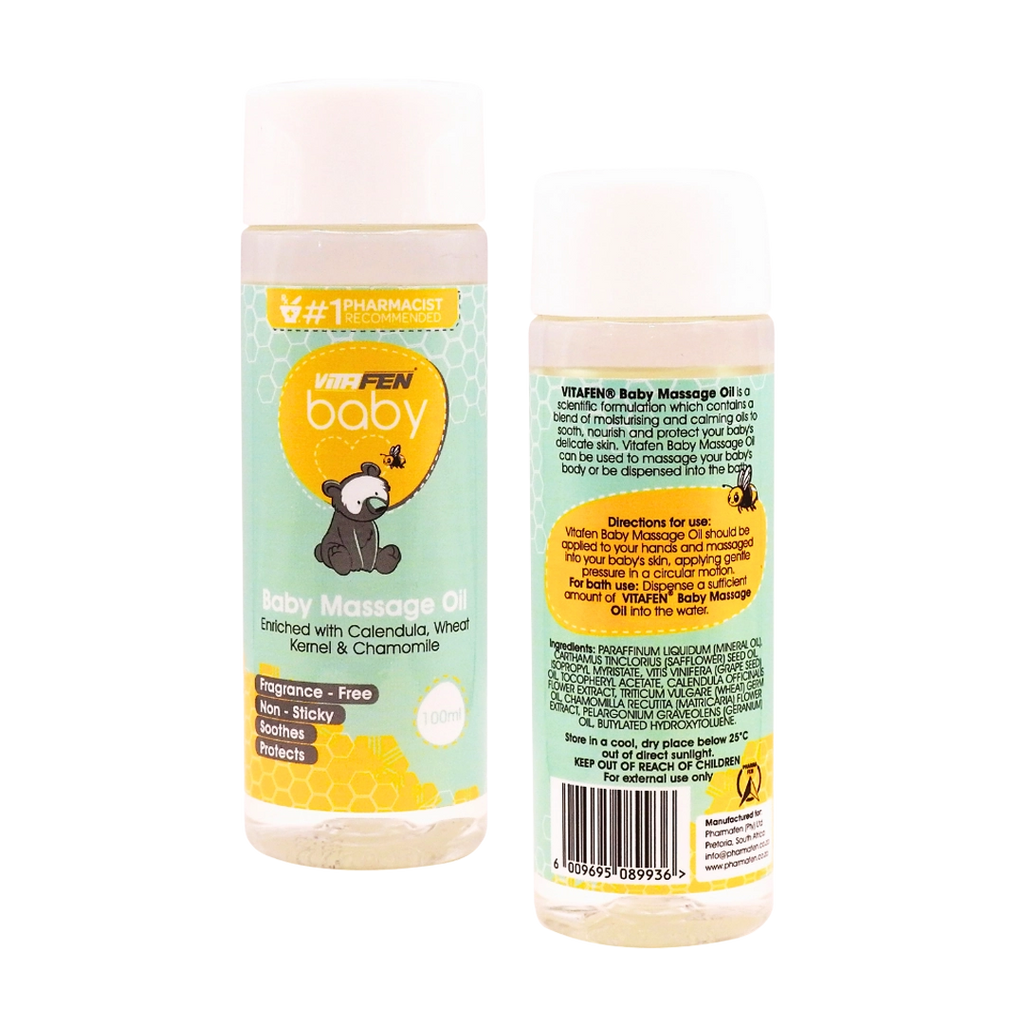 Vitafen Baby Massage Oil is a scientific formulation which contains a blend of moisturising and calming oils to soothe, nourish and protect your baby’s delicate skin.
