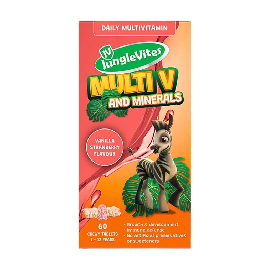 JungleVites Multi V Strawberry Vanilla 60 Tablets are packed with all the essential minerals and vitamins little bodies need. They are chewable, have animals shapes, and a delicious strawberry-vanilla flavour to make them enjoyable for kids to take.