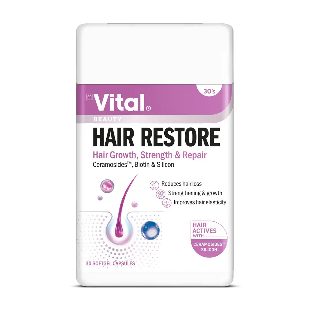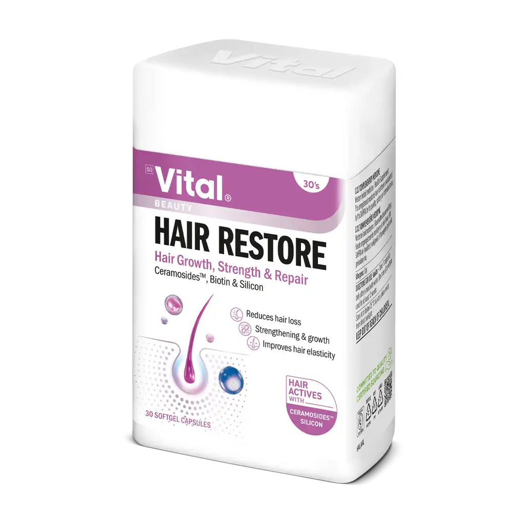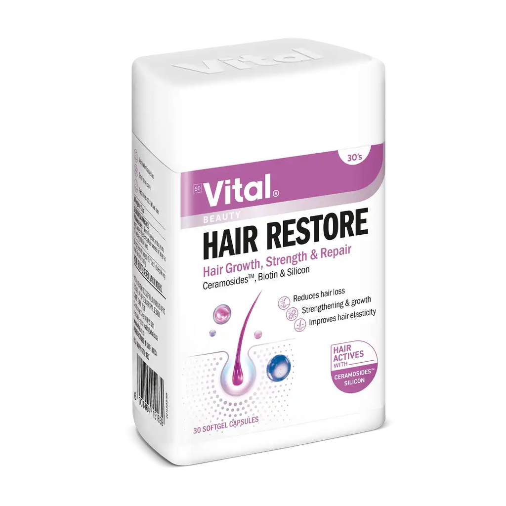 Vital Hair Restore – Strengthen your strands from root to tip. Vital Hair Restore contains therapeutic levels of Ceramosides that is clinical tested to reduce hair loss, improve elasticity and hair growth, and promote shinier, healthier hair.