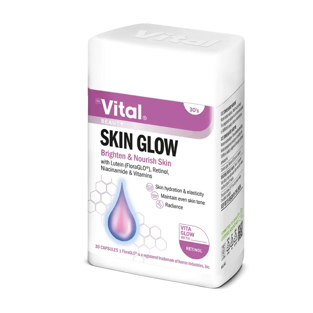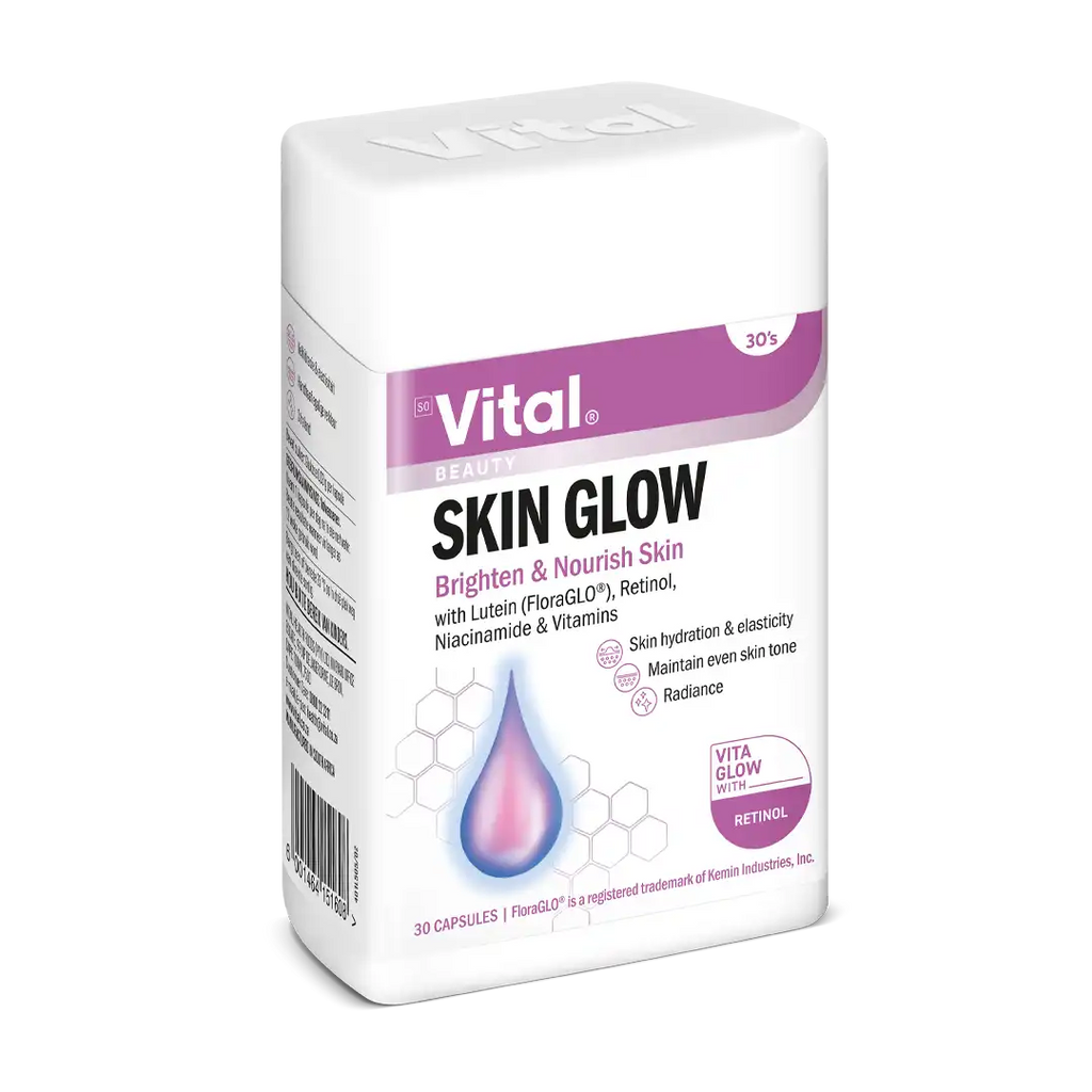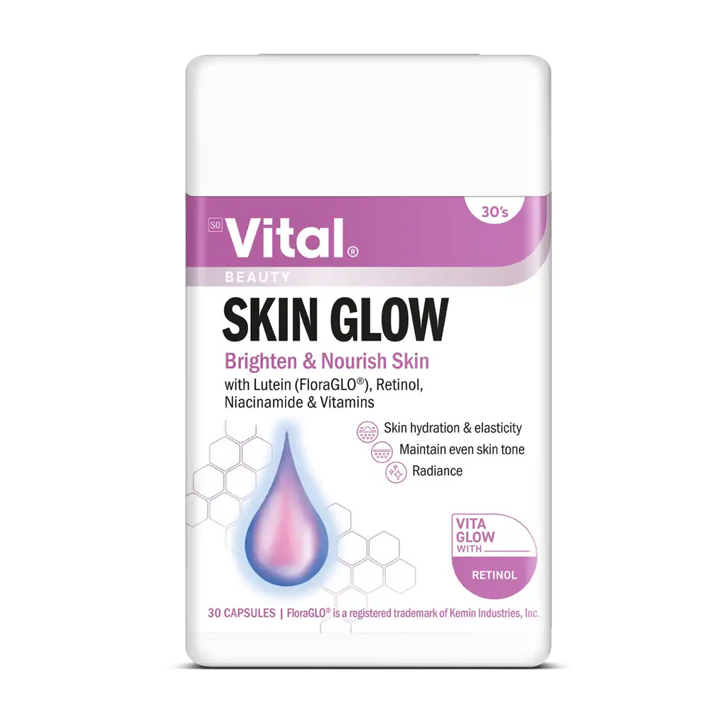 SKIN GLOW is your daily beauty-from-within essential, formulated to brighten and deeply nourish your skin. Featuring FloraGLO® Lutein, Retinol, Niacinamide, and a blend of key vitamins, this skin-supp orting formula promotes hydration, elasticity, and a naturally radiant glow. With marigold-derived l utein and zeaxanthin, SKIN GLOW helps maintain even skin tone, supports lipid barrier function, and protects against oxidative stress. These carotenoids are scientifically shown to increase skin hydra tion, improve elasticity, and reduce signs of dullness caused by environmental damage. Nourish your skin from the inside out and let your glow show.